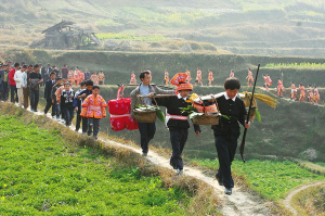 貴州省丹寨縣排調(diào)鎮(zhèn)苗族青年結(jié)婚,婚禮簡單淳樸,形式別具一格。女孩子出嫁視家庭條件陪送谷子或糯米,家庭...