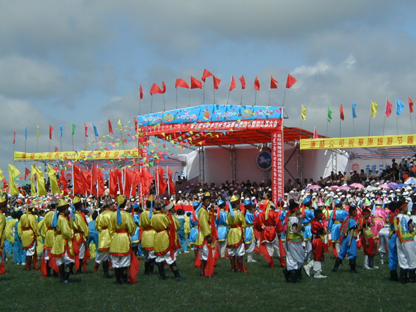 大草原最宜人的時(shí)節(jié)莫過(guò)于七八月。屆時(shí),蒙古族牧民們,就會(huì)穿上盛裝,不管路途多遠(yuǎn),男女老少,舉家乘車騎馬,云集到綠海如茵的草原上。世界各地的游人也會(huì)紛至沓來(lái),素日寧?kù)o的草原頓時(shí)沸騰起來(lái),藍(lán)天白云之下,彩旗飄揚(yáng),人流涌動(dòng),羊歡馬叫,呈一派繁榮景象。這就是蒙古民族一年一度的草原盛大節(jié)日——那達(dá)慕大會(huì)隆重開(kāi)幕。