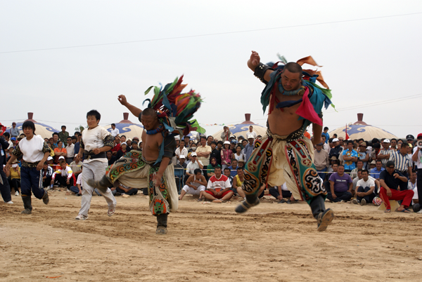 蒙古族摔跤(搏克)既不同于中國(guó)式摔跤,也不同于日本的相樸,其規(guī)則、方法、服裝、場(chǎng)地等方面都有自己的特點(diǎn)。比賽規(guī)則和方法是:不分等級(jí)(不分年齡、不分體重),沒(méi)有人數(shù)限制,只要是2、4、6、8、16、32、64、128等雙數(shù)即可。所有選手由德高望重的裁判負(fù)責(zé)編排配對(duì)或抽簽配對(duì)后上場(chǎng)。比賽實(shí)行單淘汰制,一跤定勝負(fù),失敗者不許再上場(chǎng)。每輪淘汰半數(shù)。裁判員發(fā)令后,雙方握手致意,然后開(kāi)始交鋒,一般不限時(shí)間,可以采取勾、拉、踢、絆、推、抱、舉等各種方法和技巧,但不能抱腿摔,也不準(zhǔn)亂踢,更不能扯褲子,膝蓋以上任何部位著地即為失敗。摔跤手有專(zhuān)用服裝,上身為牛皮或帆布制成的緊身半袖坎肩“昭德格”,下穿肥大的摔跤褲,腳蹬蒙古靴,頸上套五顏六色的布條項(xiàng)圈。比賽場(chǎng)地簡(jiǎn)單,只要有一片草坪或松軟空地,觀眾席地圍坐,摔跤手就可以在中間進(jìn)行比賽。賽前,雙方都有人高唱挑戰(zhàn)歌,以造聲勢(shì)。摔跤手入場(chǎng)、退場(chǎng)時(shí)都要模仿虎步或鷹步動(dòng)作,跳躍行進(jìn),威武雄壯。冠軍獲重獎(jiǎng),并在民間享有極高聲譽(yù)【圖為跳躍入場(chǎng)的摔跤手,劉軍攝影】。