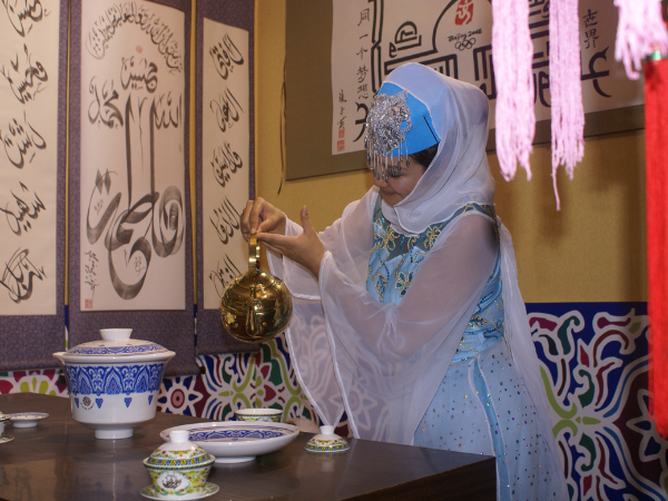 回族普遍喜歡飲茶?;刈逑让裣彩程鹌?,在中國茶文化影響下,形成了以甜味為特色的飲茶習(xí)慣。飲茶之風(fēng)興起于中國晉代,盛于唐代以后,隨之出現(xiàn)了茶具,其中以包括茶托、茶碗、碗蓋的“三坯胎”蓋碗美觀實(shí)用?;刈謇^承發(fā)展了這種茶文化,形成了以“三炮臺(tái)”為茶具的“八寶蓋碗茶”:在茶具中放入茶葉(茉莉花茶、陜青茶、紅磚茶、窩窩茶、毛尖等)、糖(白糖、紅糖、冰糖、梨膏糖等)及紅棗、核桃仁、桂圓肉、芝麻、葡萄干、枸杞(或柿餅、山楂、姜片、果干)等配料,用開水沖制后飲用。茶葉及配料在不同的地區(qū)、不同的季節(jié),根據(jù)飲茶者的身體狀況與喜好有不同的搭配,如“紅糖磚茶”“冰糖陜青茶”“三香茶”(茶葉、糖、桂圓)、“白四品”(陜青茶、白糖、柿餅、紅棗)、“紅四品”(磚茶、紅糖、紅棗、果干)、“五味茶”(綠茶、山楂、芝麻、姜片)等。八寶茶具有生津解渴、開胃健脾的作用,放入不同的茶料,又具備了不同的健身康體功能。