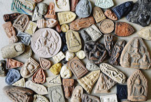 我在曼谷一家有40年歷史的佛像店“佛光工藝社”采訪時問到老專家這樣一個問題:泰國現(xiàn)在大概有多少種圖案的帕肯?所有聽到這個問題的人都是一聲驚嘆,然后笑說:“無數(shù)!”我非要問出個數(shù)來,他們便告訴我,泰國是一個歷史劃分復(fù)雜、族源廣博的國家,因此其包容性很強(qiáng),雖然九成以上的人信仰佛教,但是婆羅門教、道教、伊斯蘭教、基督教等在泰國都被接納,還有本土的一些法術(shù)也不曾被丟棄。所以,每天每個來定做的人都會有不同材質(zhì)的要求,不同圖像、符咒的組合,僅一個工藝社40年來就已經(jīng)做過幾十萬種的圖案組合。我收藏的擦擦有不同年代、不同材質(zhì)、不同價值的,除去年代久遠(yuǎn)的,頗有價值的就是一個藥擦,那是一個大威德金剛擦,專家說從被剝落的剖面看,里面有藥材的成分。我知道,在西藏,擦擦因材質(zhì)和制作人不同而有很大的區(qū)別。擦擦中最為稀有難求的一種叫“布擦”,那是寺廟僧人在保存活佛法體的時候,將那些浸透活佛法身血水的鹽巴或其它藥物和泥土融合后制成的。另一種較為珍貴的擦擦是活佛的骨灰與泥土摻混在一起制作而成的。還有一種藥物擦擦,是用不同的名貴藥材如珍珠、瑪瑙、藏紅花等藏藥合成制作,可服用治病。最普通的擦擦用一般的泥土制作,好一點的有膠泥、陶土、白泥等,這種擦擦成本低廉,在民間流傳最廣。