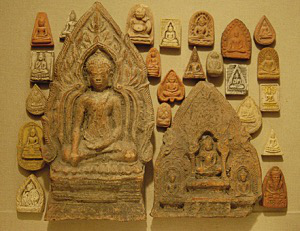 在泰國最北邊的城市清萊的一座古寺里,年長的僧人告訴我,在泰國,帕肯(“泰國擦擦”,泰語為“Phra-Kruang”,這個名詞在標(biāo)準(zhǔn)的泰文詞典里的解釋是:用于避兇消災(zāi)的小型佛像,作用相當(dāng)于護(hù)身符、祈愿物、供奉物。泰國的Phra-Kruang至今沒有一個公認(rèn)的中文名稱,既然“擦擦”是譯音,我便挑了兩個最接近泰語Phra-Kruang發(fā)音的字給它:帕肯)的使用方式是這樣的:最早是在修建寺廟的時候放入佛塔內(nèi),因為古帕肯的內(nèi)容全是佛像,經(jīng)過高僧們開光后放入塔內(nèi)有增加靈氣的作用。百姓通常是到寺廟請回自己需要的帕肯回家供奉,或者作為還愿,出資請寺廟制作一定數(shù)量的帕肯,供奉在寺廟、家中或者贈送親友。