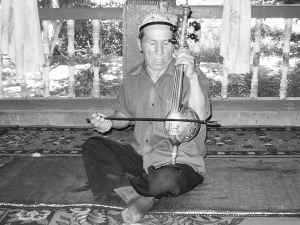 剛下車,就聽(tīng)見(jiàn)平房里傳來(lái)了蒼涼、沙啞、如泣如訴的琴聲和悠揚(yáng)的歌聲。這就是艾捷克的聲音嗎?簡(jiǎn)直叫人心顫!我感嘆著,回頭問(wèn)同行的翻譯薩達(dá)提·瓦依提。他仔細(xì)聽(tīng)了聽(tīng),笑道:“這是艾捷克演奏的《青牡丹夏爾瓦努》!”“難怪這么深情婉轉(zhuǎn)?!蔽一腥淮笪颉?/p>
