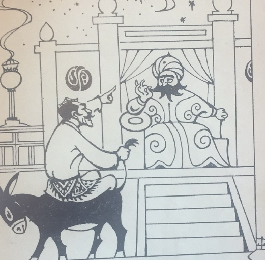 阿凡提一手舉起毛驢的尾巴,一手指著國(guó)王的下巴,說(shuō)道:“您的胡須恰好同我的毛驢尾巴上的毛一樣多呀!”
