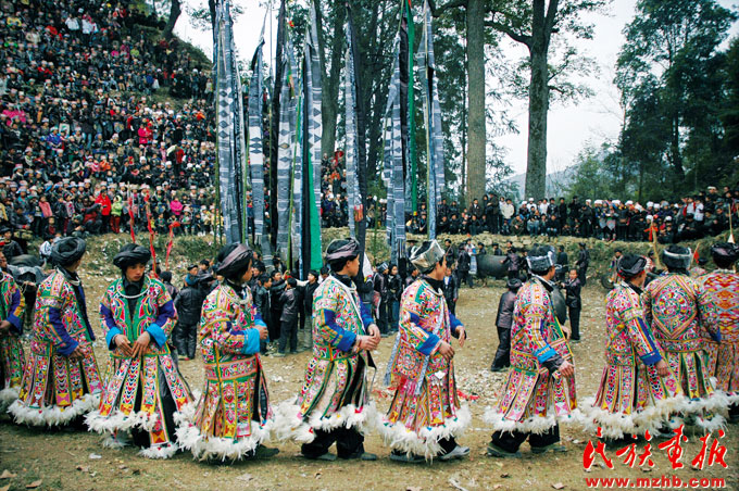 苗族的歲時節(jié)慶獨特鮮明。傳統(tǒng)節(jié)慶按功能可分為:物質(zhì)交流節(jié)慶;男女社交、戀愛、擇偶節(jié)慶;祭祀性節(jié)慶;紀(jì)念性、慶賀性節(jié)慶。