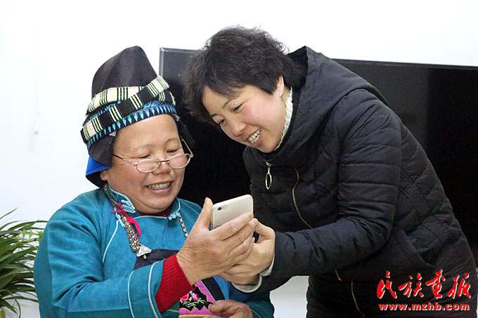 寧曼麗(右)和吳安麗在討論長(zhǎng) 10 米、寬 1.6 米的蠟畫(huà)《百鳥(niǎo)圖》