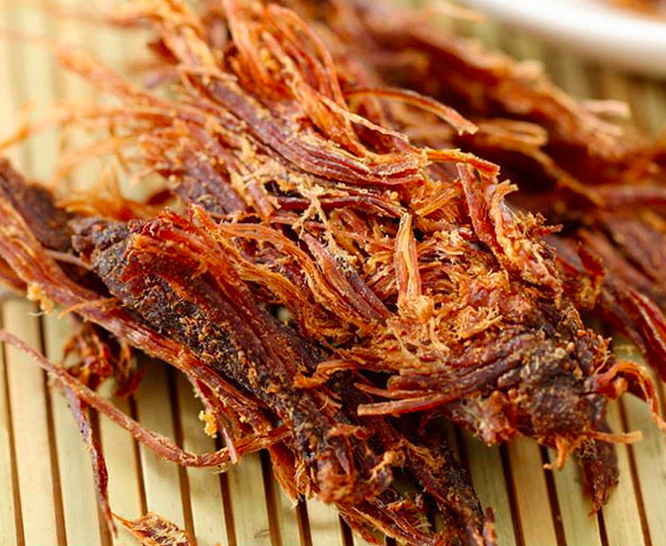5、捶:將刮干凈的干巴置于砧板,用特制的木捶四周捶,用力要猛,要準,同時要注意安全,捶數(shù)下,待干巴的呈細絲狀,取出。