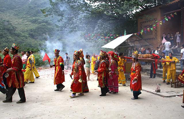 在酬謝自然之神后,由祭司念誦祭文,紀(jì)念民族英雄瓦氏夫人,頌揚瓦氏夫人率領(lǐng)將士打擊倭寇的英雄事跡,傳授民族歷史知識,宣揚保衛(wèi)家園、謀求平安的民族精神。