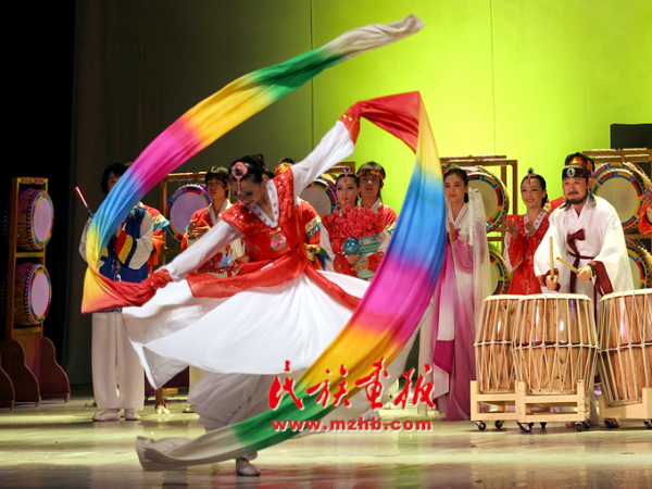 朝鮮族舞蹈種類繁多,各具特色。除了傳統(tǒng)的農(nóng)樂舞、象帽舞、長鼓舞和頂水舞之外,還有雄壯的刀舞、典雅的扇子舞、神秘的假面舞等等,它們或舒緩,或剛毅,或柔美,或稚拙,輕歌曼舞間,你仿佛觸摸到了一個(gè)古老民族的靈魂,它是那么深沉內(nèi)斂,又是那么熱情奔放!