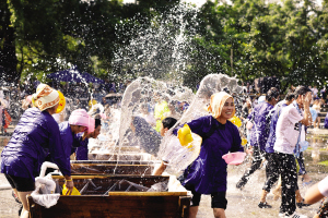 “扁水”是當(dāng)?shù)胤窖?,為戲水、潑水之意?!氨馑笨駳g節(jié)源于侗族“為也”習(xí)俗,為做客之意,指村寨之間村民們的互相訪問,是當(dāng)?shù)匾?guī)模最大的社交和娛樂活動(dòng)。“為也”時(shí),當(dāng)?shù)囟弊迦罕姂蛩娝駳g,久而久之就形成了“扁水”狂歡節(jié)。