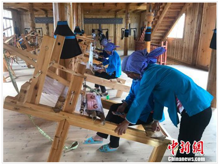 聽聞姐姐在這里織錦每月可拿到3000多元的收入,今年7月,此前在廣東務(wù)工的文坡村二組村民龍練霞干起了這份家門口的工作,再也不想外出了?!凹确奖阏疹櫦胰?,又可以抽空干點(diǎn)農(nóng)事?!苯衲?0多歲的龍練霞說(shuō)。和她一樣,看到侗錦的銷路慢慢打開了,村里許多在外務(wù)工的年輕人也紛紛返鄉(xiāng),拾起祖輩們的老手藝。