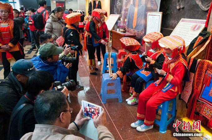 12月6日,在中國(guó)瑤族之鄉(xiāng)廣西金秀瑤族自治縣的盤王節(jié)上,當(dāng)?shù)乩弦惠叕幾鍕D女展示瑤族織繡