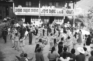從古至今,每年的正月初九“舍巴節(jié)”(舍巴:土家語(yǔ)擺手舞的意思)、三月三“祭祖節(jié)”、“冬至?xí)保良胰硕家跀[手堂舉行盛大的祭祀活動(dòng)。農(nóng)閑時(shí)的夜晚,在農(nóng)家院壩,點(diǎn)燃熊熊篝火,男女老少在有奏的鑼鼓聲中歡快地舞蹈,盡情地歌唱。清代文人彭施鐸在《竹枝詞》中載:“福石城中錦作窩,土王宮前水生波,紅燈萬(wàn)盞人千疊,一片纏綿擺手歌?!绷攘葦?shù)語(yǔ)把土家人跳擺手舞的盛況真實(shí)地展現(xiàn)出來(lái)。