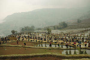 上午10點(diǎn),由上千名當(dāng)?shù)毓嶙遛r(nóng)民和彝族農(nóng)民組成的表演團(tuán)隊(duì),在20平方公里之廣袤的梯田間開(kāi)始載歌載舞,展現(xiàn)當(dāng)?shù)氐纳贁?shù)民族放牛、插秧、抓魚(yú)、婚禮等生產(chǎn)生活方式。梯田、森林、村莊、河流在1小時(shí)的演出中渾然一體,征服了當(dāng)?shù)厝罕姾蜕锨型庥慰汀?/p>