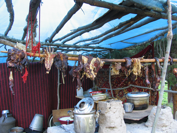 哈薩克民族以游牧為生,其主要的生產(chǎn)方式是畜牧業(yè),所以哈薩克族的飲食文化也與其生產(chǎn)方式息息相關(guān)。哈薩克族物質(zhì)生活與精神生活的方方面面都透露著畜牧業(yè)和草原游牧生活的濃郁氣息,例如大多數(shù)的哈薩克民族飲食都與畜產(chǎn)品肉、奶制品有關(guān)。牛、馬、綿羊(山羊)、駱駝等家畜的肉和奶是哈薩克民族飲食的主要原料。日常生活中他們的主要飲料是奶、“柯莫孜”(馬奶子)、“舒巴特”(駱駝奶)等。還有用乳汁為原料制作而成的酸奶疙瘩、奶酪、“蘇孜別”“葉吉蓋”“杰尼特”等食物非常美味。也就是說,以畜牧業(yè)為主的生產(chǎn)方式影響著哈薩克族人民生活的方方面面。奶類和肉類是日常生活的主要食物,面食是次要的食物,哈薩克族很少吃蔬菜。肉食主要有綿羊肉、山羊肉、牛肉、馬肉、駱駝肉,除此之外,還有野獸肉和野禽肉也是人們補(bǔ)充的肉食,其做法主要有煮、熏、烤三種。