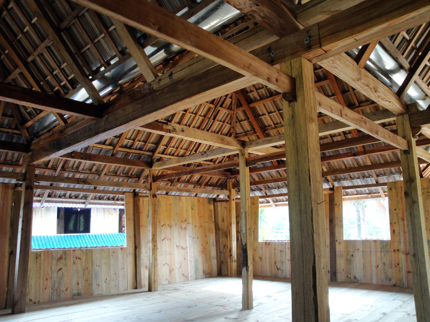 德宏瑞麗一帶的竹樓由“干欄”和平房兩部分組成,“干欄”是住房,平房是廚房?!案蓹凇倍酁殚L方形,下層架空,可堆放雜物。上層做橫向分割,成一間堂屋和數(shù)間臥室。堂屋中設(shè)有火塘,一般用于燒茶,在一角設(shè)有佛龕。堂屋外有開敞的前廊和曬臺(tái)。屋頂為歇山式,脊長,坡面平緩,外墻開窗,有的還是落地窗,墻與屋頂之間有縫隙,這些都加強(qiáng)了室內(nèi)空氣的流通,達(dá)到了室內(nèi)陰涼的效果。