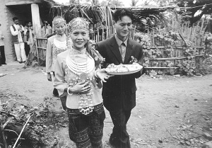 上午10點(diǎn),新娘要“回返”娘家。伴娘挑著兩只籮筐,一邊放有糯米和豬肉,另一邊放著一件衣服。這件衣服只能是黑色或藍(lán)色,不能是花色和白色。據(jù)說花衣服新娘穿了會(huì)花心,白色則不吉利。這件衣服是婆婆特地送給新娘的,今后一定要穿。新娘和伴娘一起走在回返的路上,新娘舍不得離開婆家,走到村口,就把糯米飯和豬肉分給過路人吃,以示新娘的熱情好客。我也吃了籮筐里的糯米飯和豬肉,覺得很香,很好吃。之后,新娘和伴娘不再往娘家走,而是返回了婆家。