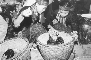 按照黎家人的規(guī)矩,“提親”是由男方家人請(qǐng)族內(nèi)的一位親嫂嫂當(dāng)媒人,帶著檳榔、簍葉、煙絲到女方家。如女方本人及家人樂意接受禮品,說明親事已定下來了。