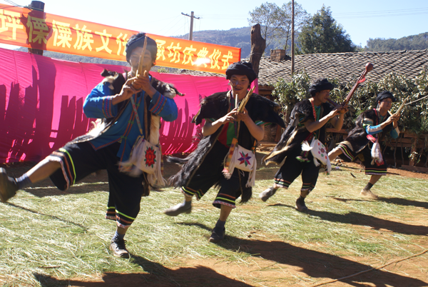 節(jié)日里,婦女們穿著鑲花邊的黑色上衣和點綴著各種銀飾物的花裙,佩戴耳環(huán)、項鏈等首飾,風(fēng)采奪人。男人穿著麻布短衣褲,腰系紅黃長帶,小腿系吊簡,腰佩長刀,肩挎箭包,英姿勃勃。節(jié)目的廣場上,堅趄兩根二十米高的樹干,四周用藤蔓拉緊固定,樹桿上插有三十六把明晃晃的長刀,作為向上攀登的橫檔,刀刃向上,寒光逼人,謂之“刀竿午間。鞭炮齊鳴,鑼鼓震天”。身穿大紅抱、頭纏紅布包頭、赤腳的五名“玩火者”,齊涌至竿下,圍繞刀竿唱歌跳舞,將斟滿的白酒一飲而盡,縱身飛上刀竿。雙手緊提刀面,運足氣的腳掌斜置在鋒利的刀刃上,勇敢、靈巧地向上攀登。全場鴉雀無聲,大家屏住呼吸仰面觀看,對他們的氣功絕技贊嘆不已。噼噼啪啪的鞭炮聲來自竿頂優(yōu)勝者,響徹云霄。全場歡呼跳躍,爭相向爬桿者敬獻美酒。對歌、跳舞、蕩秋千活動為節(jié)日增添了濃郁的氣氛。丟煙包(煙盒)活動別具一格,青年男女各站一方,互擲煙包,姑娘將小伙的煙包收藏起來,說明姑娘接受了小伙子的愛慕。