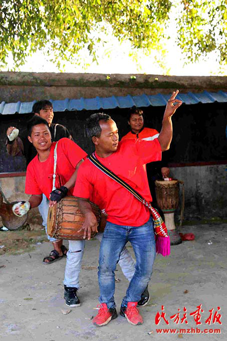 沿著曲折的山路開車一個(gè)多小時(shí),記者來(lái)到西盟縣秧洛村一組,恰巧碰到了一對(duì)新人喜結(jié)良緣。清脆的木鼓聲在大山里回蕩,秧洛村的村民喝喜酒、跳木鼓舞。