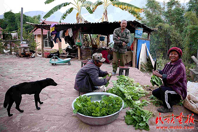 在娜作家記者見到了娜作的老伴兒大巖恩,他邊清理打捆著剛剛采摘下來(lái)的青菜邊說(shuō):“這些小菜城里人特別愛吃,沒有上化肥,一點(diǎn)污染沒有。這筐菜在城里一定能賣個(gè)好價(jià)錢?!?/p>