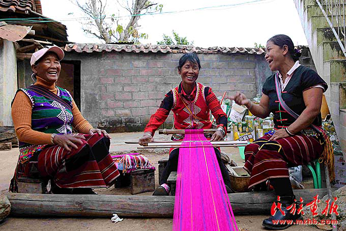 在娜巴來(lái)家,兩位表姐正在繡佤族服飾背包