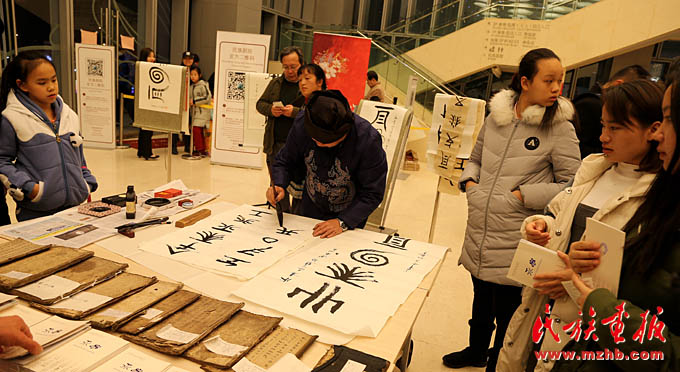 水書藝人在大廳向觀眾展示水書書法文化