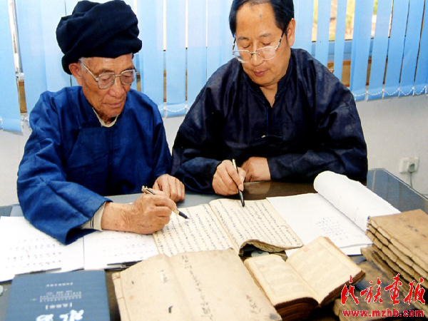 韋章炳先生獲得了黔南州首批非物質(zhì)文化遺產(chǎn)傳承人榮譽稱號,圖為第十三代水書傳人韋光榮與韋章炳先生一起翻譯水書