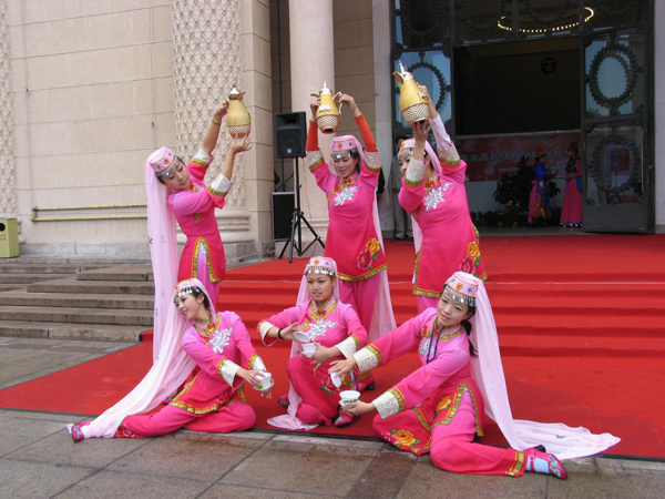 宴席曲:流行在中國西北地區(qū)回族、東鄉(xiāng)族、撒拉族、保安族的傳統(tǒng)習(xí)俗性舞蹈。是迎親時(shí)男方宴請女方送親者的宴席間演唱的歌舞形式。曲調(diào)優(yōu)美,節(jié)奏性強(qiáng);歌詞多敘述民間故事、傳說和一些幽默逗趣的內(nèi)容。舞蹈動(dòng)作不配合歌詞具體內(nèi)容,只表達(dá)歡樂的情緒。宴席曲多為2—8人的男子對舞,相互換位后,有屈膝半蹲、雙手伏膝的行禮姿態(tài)。其基本步法一般是腳尖或腳掌先落地、膝部屈伸,使身體如波浪起伏,與頭部的擺動(dòng)、顫動(dòng)相協(xié)調(diào)。手勢有單晃手、雙晃手、掏手、望月等,舞姿灑脫昂揚(yáng),表現(xiàn)了高原民族豪放、開朗和詼諧的性格。