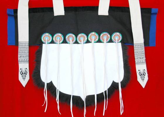 七星披肩所用材料為黑色綿羊皮,先將羊皮去毛、洗凈、硝白、縫成披肩,然后在披肩背上繡上自己縫制精美的七顆星星,每個星星中心垂下兩條布帶,整個布帶與白色寬帶相繞,帶梢端垂于后,披肩的兩角釘上兩條白布帶,勞動時拉到胸前交叉系緊。”這樣一件精美的“披星戴月衣”是對勤勞的納西族婦女的歌頌,形如蛙身狀的披肩是古代納西族圖騰崇拜的標志,在納西族傳統(tǒng)中,青蛙是智慧之神,反映了納西族在美學(xué)、習俗等方面形成的傳統(tǒng)觀念和心理特征。