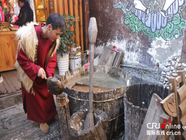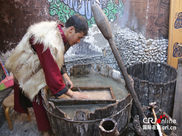 納西族男子楊慧杰展示東巴紙的造紙過程