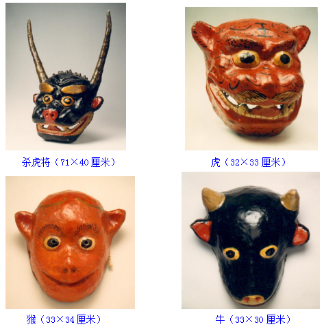 “殺虎將”反映的是當(dāng)?shù)匾暈樯酵鯛數(shù)臍⒒槊癯?,降伏老虎的?nèi)容。面具角色有牛、虎、猴、殺虎將。牛象征農(nóng)民,代表善,虎和猴象征禍害。表演牛和虎、猴激烈打斗,當(dāng)牛被打敗倒地時,殺虎將持劍上場,打殺格斗等場面。此時場外觀眾上場助戰(zhàn),直至將虎降服,整個場面熱烈緊張。