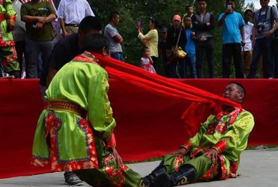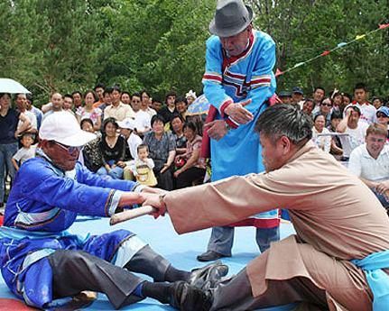 頸力賽和扳棍一樣,也是達斡爾族傳統(tǒng)的競技項目之一,在達斡爾族之間十分流行。頸力賽的比賽方式和扳棍相似,比賽雙方需要端坐在平地上,蹬直雙腿,腳掌相對,雙手叉腰或放在腿上,用布腰帶套在雙方脖頸后部。當(dāng)裁判員聲響后,比賽雙方需要互相用脖頸力拉扯對方,哪一方被拉起或屈膝歪倒,就輸?shù)袅吮荣悺?/p>