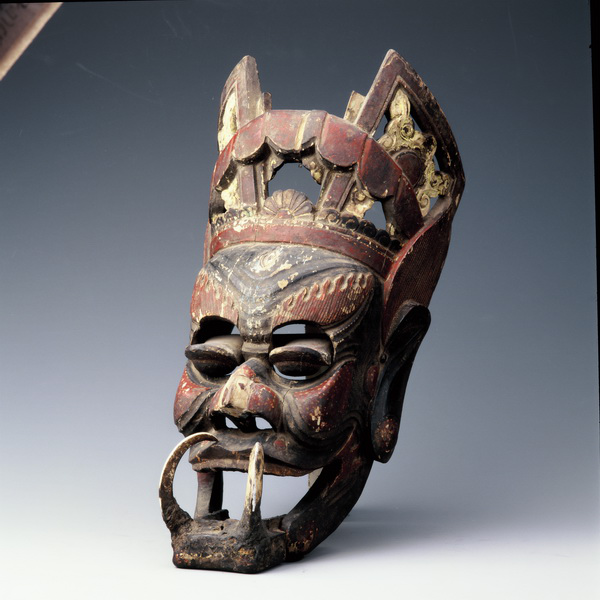 民族文化宮博物館所藏儺面具“山王”呈兇惡之相。它頭戴高大的雕花頭冠,大耳,尖尖的耳翅取代了抱耳神,劍眉倒豎,雙眼可自由閉合,鼻梁高聳,大嘴寬闊,下頜活動自如,長獠牙畢露,神情兇猛可怖,面部飾紅黑兩色。其造型、色彩、神態(tài)給人恐怖猙獰之感。