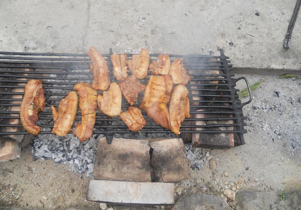 肉類多以豬肉、雞肉等蓄禽類肉蛋為主。逢年過節(jié),以豬肉為原料烹調(diào),能做出各種不同的花樣飯菜。隴川地區(qū)的風(fēng)味名菜“火燒豬”,做法和吃法獨特,別具風(fēng)味。在副食品種類中,瓜果、豆類、蔬菜的種類最多。蔬菜以菜園自留地種植為主,還兼采野生菜輔于飯食,如香菜、水芹菜、魚腥草、香椿、蕨菜、竹筍等,野生菌類也是阿昌族喜歡的副食品。阿昌族半山半壩地區(qū)的可食菌類品種繁多,共有50多種。
