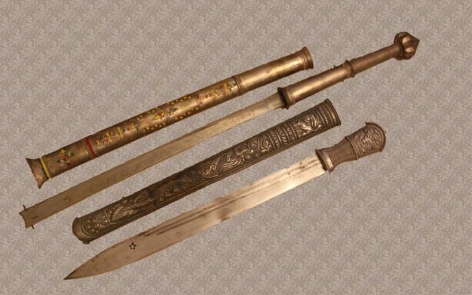 ★配刀把和刀鞘。刀把和刀鞘多用楠木加工而成,有的用銅、銀皮包裹,上面雕刻裝飾有各種花紋圖案,如“猛虎長(zhǎng)嘯”“東山日出”“飛燕迎春”“十二屬相”等,佩刀上還系有紅纓背帶,匕首的把多用牛角雕刻裝飾而成。