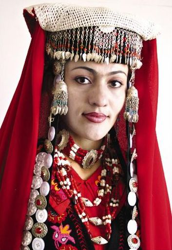 塔吉克族女子愛(ài)戴首飾,最引人注目的要數(shù)新郎和新娘的裝束了。新娘的“庫(kù)勒塔”帽,前綴一排銀色小鏈子,戴長(zhǎng)長(zhǎng)的耳環(huán),頸部戴幾排碩大的項(xiàng)鏈。辮子上飾流蘇或白扣、銀元,手有手鐲、戒指。新娘頭上是一條長(zhǎng)長(zhǎng)的紅色或黃色頭巾,外穿紅色長(zhǎng)大衣,系紅白相間的手帕。