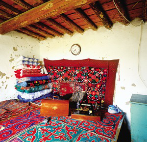 新疆維吾爾自治區(qū)木壘縣大南溝烏孜別克民族鄉(xiāng)鄉(xiāng)政府為烏孜別克牧民集中興建了定居房。新村街道整齊,土墻圍成的院落獨門獨院。院落很大,前院種菜栽樹,有水井,房后是牛欄羊圈。有的還單建了廂房作廚房。這里的住房都是長方形土坯平頂房,玻璃窗,墻壁很厚,冬暖夏涼。屋內(nèi)橫梁和走廊的木柱、木梁上有的是工筆重彩的花紋圖案,有的用雕花石膏鑲嵌或磚、木雕刻后鑲嵌,做工精細(xì)。墻壁上有整齊排列的拱形壁龕,里面擺著日用品和工藝品,四周也鑲嵌著花紋圖案。居民們住板炕,在屋里地上挖一小坑,坑內(nèi)放置火爐,鐵皮煙囪通向室外,坑上橫搭木板成板炕,板炕上鋪花氈坐毯。靠墻一邊擺著疊得整齊的被褥,繡花枕頭對稱地立在被褥上。墻上掛著壁毯,整個室內(nèi)既有局部美,又有整體美,賞心悅目。