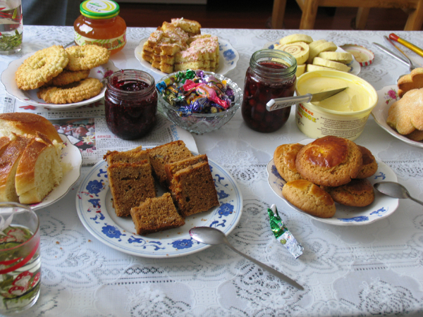 中國俄羅斯族的飲食文化既保留了傳統(tǒng)俄羅斯人的飲食特點(diǎn),也吸收借鑒了其他民族飲食文化的精髓。透過俄羅斯族的一日三餐,我們便可以窺視出俄羅斯人遷居中國之后其飲食文化的變化,俄羅斯族早餐一般是傳統(tǒng)俄羅斯面包抹黃油,喝熱牛奶;午餐為面包和菜;晚飯一般比較豐富,會(huì)吃抓飯、拉條子、米飯和炒菜。
