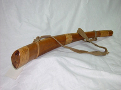 民族文化宮館藏鹿哨為紅松木質地,牛角形,長71厘米,中間鏤空,以細鱗魚皮熬膠粘合,頭部細,尾部粗并呈喇叭狀;在頭、尾、中間箍3道箍,在接近頭尾的兩端纏細皮繩為環(huán),環(huán)上系寬皮帶,便于出獵時背挎于肩或平時置放時懸掛。