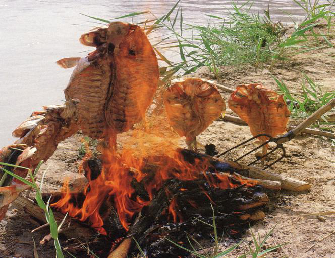 赫哲族居住的三江流域,河流縱橫交錯(cuò),群山環(huán)繞,蘊(yùn)藏著極為豐富的漁獵資源。長(zhǎng)期以漁獵為生的赫哲族人民,在征服自然、改造自然的歷史發(fā)展過程中形成了具有濃郁民族特色和地域特色的傳統(tǒng)飲食文化。其傳統(tǒng)飲食以漁獵產(chǎn)品為主,魚干獸肉,家家堆積為糧。這與農(nóng)牧民族相比,別具特色。