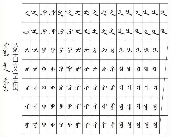 回鶻式蒙古文字是一種拼音文字。字母分元音和輔音兩大類,雖然至今人們尚未在文獻(xiàn)記載中發(fā)現(xiàn)其字母表,但據(jù)后人對(duì)這種文字材料進(jìn)行分析,歸納出有19個(gè)字母。其中,5個(gè)表示元音,14個(gè)表示輔音。書寫時(shí)元音字母和輔音字母筆畫連在一起,形成一個(gè)整體蒙古字。每個(gè)字母視其出現(xiàn)在詞里的位置不同,寫法略有變化,分詞首、詞中、詞末3種變體。阿拼寫時(shí)一般以詞為單位,上下連書。字序從上到下,行序從左到右。因其是以回鶻文為基礎(chǔ)創(chuàng)建的,因此稱其為回鶻式蒙古文。