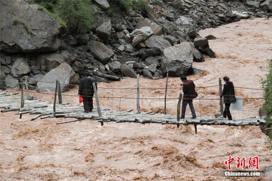 2014年,工作人員赴那曲比如縣進(jìn)行古籍普查,經(jīng)過怒江上一座簡(jiǎn)易浮橋。受訪者供圖。