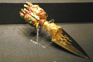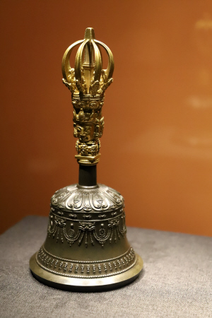 持驗(yàn)法器單元主要展示修持佛法、舉行佛事活動和佛教儀式時所用的法器,包括金剛鈴、金剛杵、嘎巴拉碗、嘎巴拉鼓、嘎巴拉念珠、喀章嘎、金剛橛、鉞刀等。本部分所選法器多為藏傳佛教密宗修行所用,因多存于庫房,已不在原佛堂陳設(shè),其用途和使用場所便難以知悉。故宮中有許多佛堂,大多是乾隆時期建造,其中很多是密宗佛堂,如雨花閣、梵華樓、梵宗樓、養(yǎng)心殿西暖閣佛堂等。