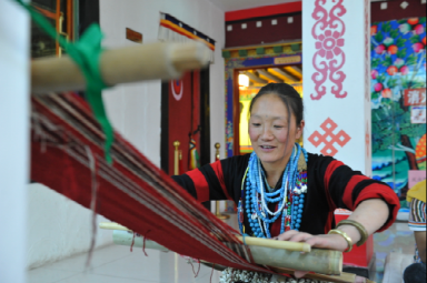 在自治區(qū)群藝館的展出現(xiàn)場(chǎng),除卻這些光鮮亮麗的民族服裝之外,另一個(gè)特殊群體也同樣吸引了眾人的目光,他們便是從西藏各個(gè)地區(qū)前來為觀眾展示藏裝制作工藝的民間手工藝人。他們有的在織布,有的在裁剪,有的在穿針引線做靴子、縫制衣服,這些數(shù)以萬計(jì)的、平凡而又偉大的民間手工藝人們,用他們幾十年如一日的堅(jiān)守,默默地承擔(dān)著民族文化創(chuàng)新與傳承的歷史使命。