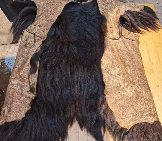 大叔介紹羊皮衣制作并不復(fù)雜,只需要把山羊皮清洗干凈,平整鋪開在墻上自然風干,十多天后取下揉搓軟后,用蓑衣針縫合便可。為了讓羊皮結(jié)實耐用,縫合羊皮的線也是用羊皮制作而成。