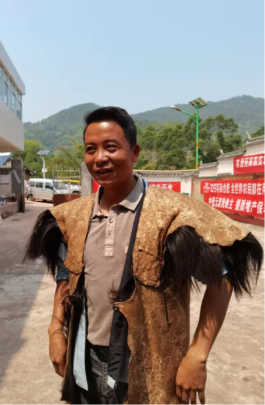 在大叔眼里,羊皮衣是祖輩傳下來的寶貝,冬暖夏涼、耐臟又耐磨,既是雨衣也是地墊。天冷時毛面朝里防寒保暖,下雨時毛面朝外化身為雨具,田間地頭勞作時還可以把它當成地墊平鋪在田埂邊休息,騎摩托車時是一件方便的防風服,實現(xiàn)了一衣多穿,多功能使用。