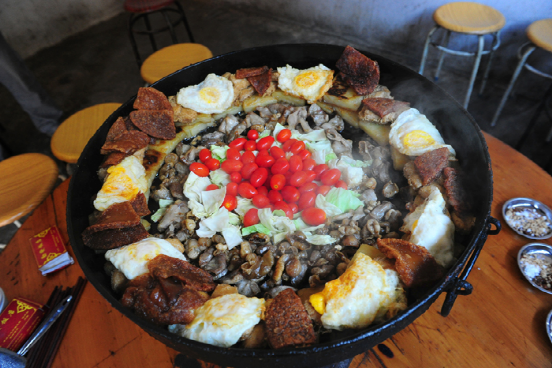 平壩凹鍋更具特色,食材十分豐富,為了拍攝平壩凹鍋小吃,我們一行來到當地人宗發(fā)英家開的勤發(fā)飯店,并被安排在二樓的里間。屋內正中支著一口平底銅鍋,下面是燒著炭火的爐子?;鸷芡?,不一會平底鍋里的油便嗞嗞作響,主人把煎得黃黃的臭豆腐、豌豆粉等放到鍋里,鍋的中間加上一些蔬菜、小個西紅柿,色彩非常漂亮,周圍都放著一碗碗用噴香的辣椒面拌有濕蘸水和干蘸水。