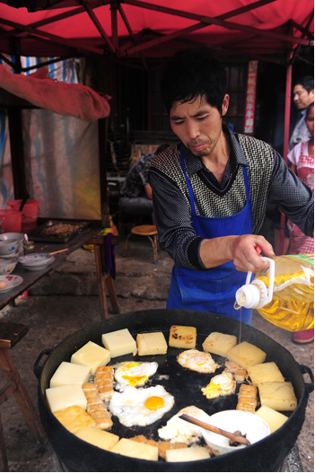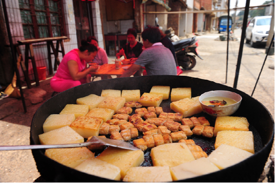 淡淡的煙味,夾雜著平壩古鎮(zhèn)特色小吃的香味,讓我們一行直咽口水。當天,除了探訪平壩古鎮(zhèn)建筑外,還大飽口福和眼福,品嘗了當地不少的小吃,不亦樂乎。
