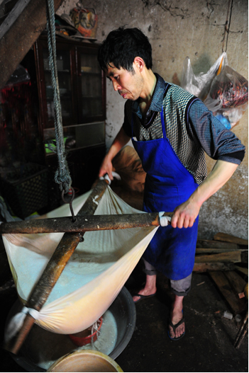 記者看到,主人開始磨豆子了,將泡好的豆子倒入機器內,一勺一勺的盛。并一邊磨一邊和我們交談,現在省事多了,以前都是推磨子的,而且制作工藝也十分講究。